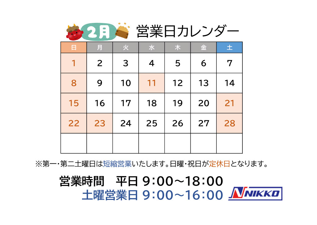平素より当店をご利用いただき、誠にありがとうございます。2月の営業日および営業時間について、下記の通りご案内いたします。
